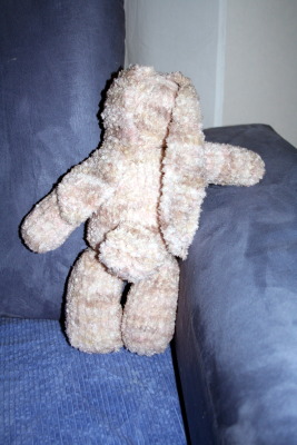 Ompele jalat vartalon alaosaan (luontireuna). Ompele etukäpälät vartalon yläosaan, mutta ei aivan yläreunaan kiinni. Kiinnitä pää vartalon auki jätettyyn päättelyreunaan luontireunastaan. Ompele vartalon auki jäänyt luontireuna umpeen. Ompele korvat päälaelle. Kiinnitä töpöhäntä takapuoleen. Ompele silmiksi napit ja kirjo halutessasi pupulle kuono.