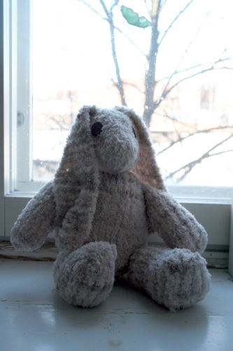 Colinette Fandango (100 % puuvillaa, 100 g / 100 m), 200 g väriä Mushroom. Todellinen langanmenekki korvien ja töpöhännän verran yli 100 g.