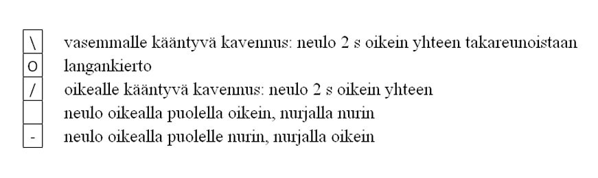 Kaavioita on kaksi: toinen helman pitsineuletta varten ja toinen raglankavennuksiin. Kaavioihin on merkitty kaikki kerrokset.
