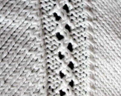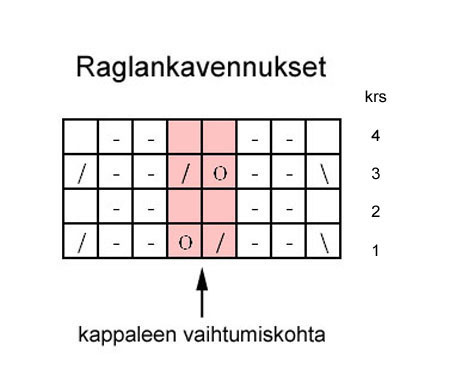 Hihojen ja vartalo-osien liittymiskohtiin tulee raglankavennukset, joiden väliin tulee nurjat raidat ja kahden silmukan levyistä pitsineuletta (ks. kaavio II). Aloita neulominen seuraavasti: neulo oikean puolen kerroksella etukappaletta, kunnes silmukoita on jäljellä 5 silmukkaa. Neulo sitten 2 s yhteen takareunoistaan, 2 s nurin, 2 silmukalla pitsiä (pitsi on merkitty kaavioon vaaleanpunaisella), 2 s nurin ja 2 s oikein yhteen. Neulo sileää, kunnes hihan silmukoita on jäljellä 5, ja tee kuten edellä. Tee toisen hihan kavennukset samoin. Kavennuksia ja pitsiä neulotaan vain oikean puolen kerroksilla. Nurjalla puolella neulo nurjat silmukat ja langankierrot nurin ja oikeat silmukat oikein. Neulo joka kerroksen 3 ensimmäistä ja viimeistä silmukkaa kuten aiemminkin. Muista samalla neuloa napinlävet oikeisiin kohtiin. Huomaa, että viimeisen napinläven jälkeen neulotaan vielä 2 krs helmineuletta.