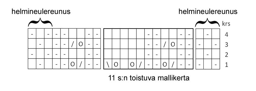 Luo 100 silmukkaa 3 mm:n pyöröpuikolle. 1. krs (nurja puoli): neulo neulekaavio I:n 4. krs. Neulo sitten kaavion I mukaisesti. Joka kerroksen kolme ensimmäistä ja kolme viimeistä silmukkaa ovat helmineuletta. Neulo, kunnes kappaleen korkeus on 6 cm. Neulo sitten sileää. Joka kerroksen ensimmäiset ja viimeiset 3 s neulotaan edelleen helmineuletta.