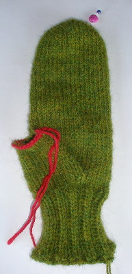 Neulo 1. ja 2. puikko normaalisti loppuun. Luo apulangalle 14 s ja neulo ne oikein 3. puikon alkuun. Nyt 3. puikolla on 25 silmukkaa. Jatka normaalisti loppuun. Seuraavalla kerroksella aloita kavennukset. Neulo 3. puikolta 13 s oikein ja 2 oikein takareunoista yhteen. Jatka neulomista normaalisti kaventaen samalla joka kerroksella. Kun 3. puikolta loppuu kavennettavat silmukat, siirry käyttämään 4. puikon silmukoita. Jatka kaventamista kunnes 4. puikolla on 8 silmukkaa jäljellä. Neulo vielä 3 kerrosta sileää tai niin kauan, että kämmen peittyy. Tee selkäpuolella viimeinen kerros ennen rannetta nurin.