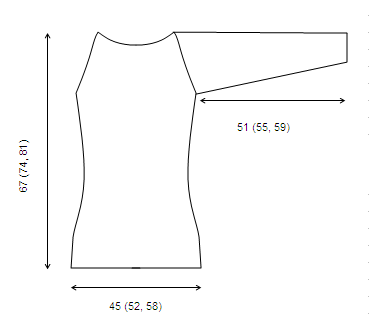 XS/S (M/L, XL/XXL). Valmiin puseron vartalonympärys on 90 (104, 116) cm ja hihan pituus 51 (55, 59) cm.