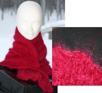 Jokaisen pitsihuiveja neulovan painajainen on varmaankin päättelykerroksella kesken loppuva lanka. Vaikka kuinka yrittää lopettaa ajoissa, satojen ja taas satojen silmukoiden päätteleminen syö yllättävän paljon lankaa. Vaihtoehtoina lienee korvaavan langan käyttö tai päättelyn ja viimeisen neulotun kerroksen purkaminen, mikäli mallineule sen sallii. Päättelykerros on kuitenkin huivissa usein se kaikkein näkyvin reuna. Vaikka purkaminen tuntuukin niin tylsältä kun kaikki on melkein valmista, kannattaa arvostaa omaa työtään sen verran, että tekee mieluummin kunnolla loppuun. Tämän sanottuani tunnustan, että itse lintsasin tämän huivin kohdalla ja päättelin viimeisen 20 cm ompelulangalla. Pörröiseen mohairiin tuo uppoaa mielestäni aika hyvin. Varastosta olisi löytynyt myös saman väristä villalankaa, mutta se erottui paljon enemmän erilaisen rakenteensa vuoksi.