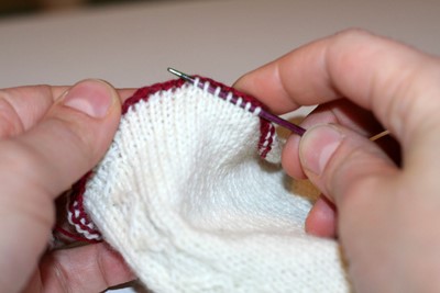 Esimerkiksi näissä sukissa mustan langan loppuessa kesken tein niin, että purin aloitusreunan resorin ja neuloin kärjet