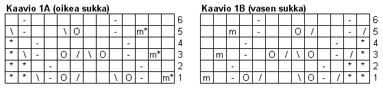 1. krs: 2 o, kaavion 1A 1. rivi, neulo kerroksen loppuun nurjat silmukat nurin, oikeat silmukat oikein.