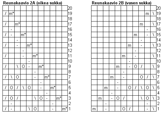Neulo kantapää, kiilakavennukset ja terä kuten oikean jalan sukassa käyttäen jalkapöydän puikolla kaaviota 1B. Kun kaavion 1B edessä ei ole enää silmukoita jäljellä ja olet neulonut viimeksi kaavion 1B rivin 4, neulo jatkossa 1. puikon ensimmäiset silmukat reunakaavion 2B mukaan. Neulo reunakaavion 2B jälkeen yhtä monta kerrosta sileää kuin oikean jalan sukassa ennen kärkikavennuksia.