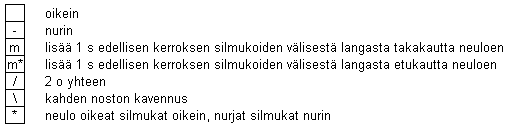 Valmistelukerros: 3 o, 1 n, 6 o, 1 n, 2 o, *1 n, 2 o* toista 13-15-17 kertaa, 1 n, 1 o.