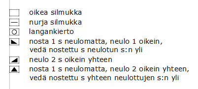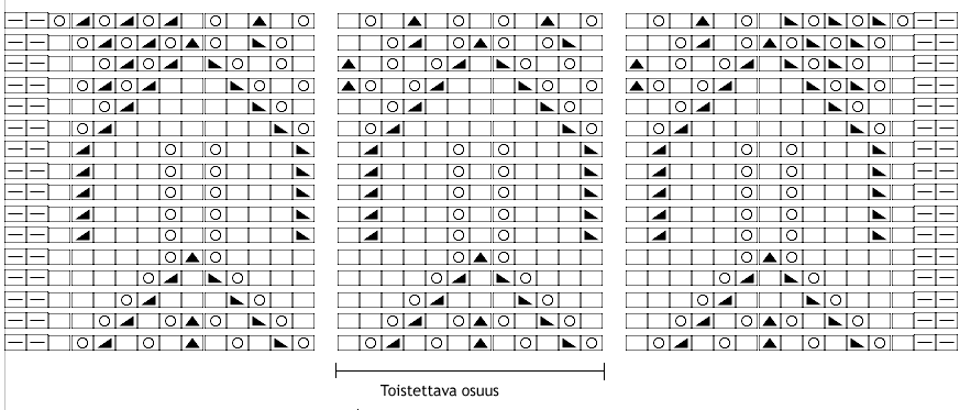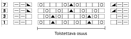 Kaavioihin on merkitty vain oikean puolen kerrokset. Neulo nurjalla reunasilmukat oikein, muuten nurin.