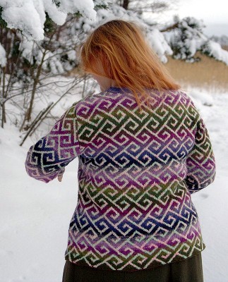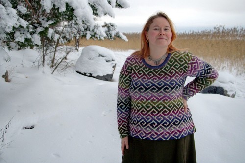 Halusin kokeilla Noron sukkalankaa, mutta koska en tunnetusti tee sukkia, piti keksiä jotain muuta kivaa. Olen pitkään miettinyt tekeväni ohuesta, meleeratusta langasta kirjoneulepaitaa ja tässäpä oiva tilaisuus. Ilu värjäsi Noron kaveriksi langan. Pyysin hailakan vaaleanpuna-limekirjavaa lankaa, jotta saisin tarpeeksi kontrastia kuvioon. Lanka näytti aika erikoiselta, mutta neulepinnasta tuli juuri sellaista kuin olin kuvitellutkin.