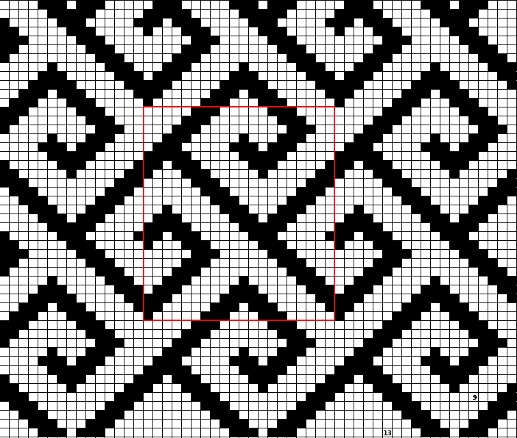 Ruutumallissa merkityt numerot "13" ja "9" ovat pohjavärin silmukkamäärät kyseisellä kerroksella. Ruutumallin valkea ruutu on Noro Kureyon Sock ja musta ruutu on Handu Handdyed bambusilkkisukkalanka.
