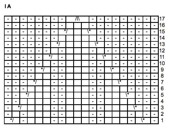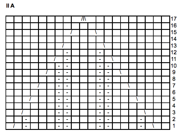 Neulo kaavion IIA rivi 1. Kaaviota toistetaan kerroksella yhteensä kuusi kertaa. Jatka neulomalla kaavion IIA rivit 2-17. Neulo 2 krs:ta sileää oikeaa neuletta.
