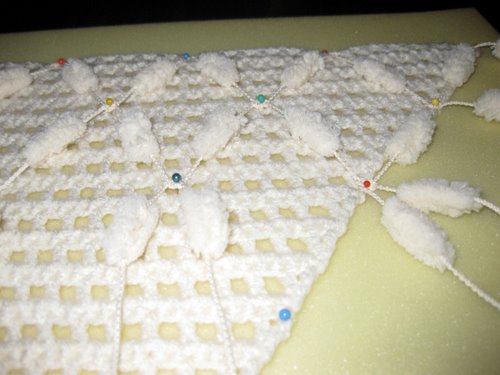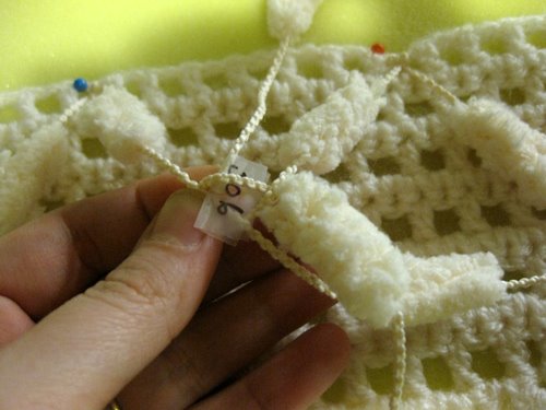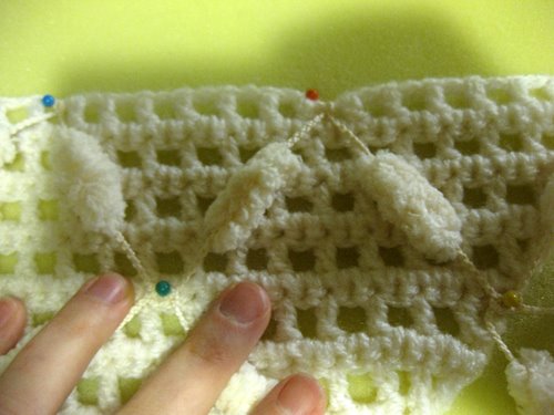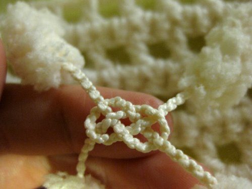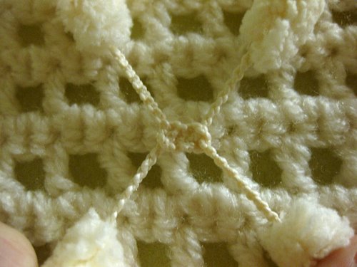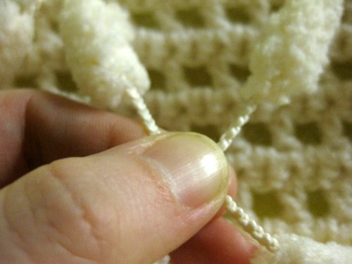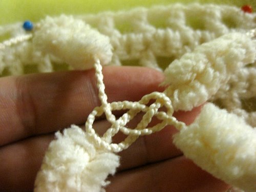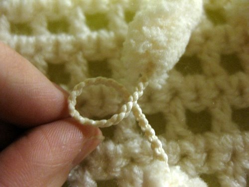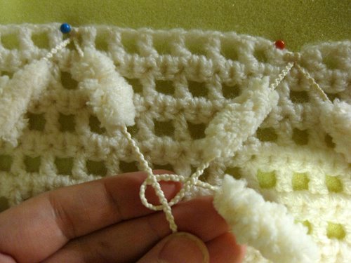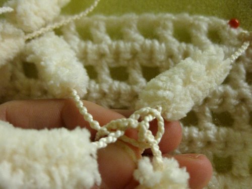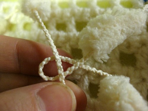 Pujota vasemmanpuoleinen lanka oikeanpuoleisen langan ja vasemmanpuoleisen langan muodostaman lankalenkin ylälohkosta läpi siten, että vasemmanpuoleinen lanka tulee päällimmäiseksi. Kuvassa tilanne, jossa vielä yksi pompula on pujottamatta lankalenkistä läpi.