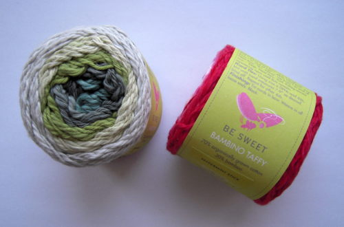 Bambino Taffya valmistaa eteläafrikkalainen Be Sweet Inc., joka on Reilun kaupan jäsen. Koska 70 % langan materiaalistakin on luonnonmukaisesti valmistettua, on kyseinen lanka oiva valinta eettisesti valveutuneelle ja tiedostavalle neulojalle. Bambino Taffy myydään kerillä, jotka näyttävät samanlaisilta kuin kerijälaitteella kerityt kerät. Vyöte on raikkaan vihreä, ja värit ovat pirteän keväisiä. Värien nimet sopivat hyvin karamellinkirjaville raitalangoille: esimerkiksi testilankojen värit olivat spearmint gum ja peppermint stick, eli vapaasti suomennettuna viherminttupurukumi ja piparminttupatukka. Eriväriset raidat ovat yhtä pitkiä ja niiden värit sointuvat kauniisti yhteen.