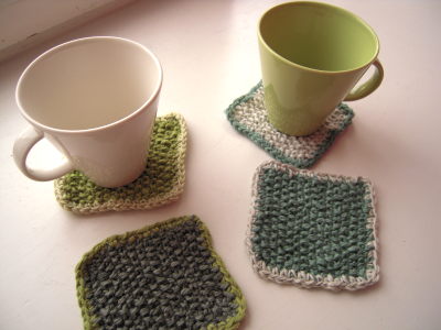 Testikeristä toinen päätyi kahdeksi tiskirätiksi. Kerästä saa kaksi reilun kokoista rättiä. Toisesta kerästä syntyi erivärisiä lasinalusia. Neulomalla jokaisen alusen eri värillä välttyy solmujen neulomiselta. Ylijääneistä langoista voi virkata alusiin vielä tehosteväriset reunat tai pienen patalapun vaikkapa teepannulle. Mikä parasta, käytön jälkeen alusen voi kastella, pyyhkiä sillä pöydän ja heittää pesukoneeseen.
