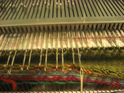 Ota työhön 102 - 108 - 114 - 120 - 126 - 132 koukkua ja palauta niistä kaksi kolmesta takaisin A-asentoon eli pois työstä. Työasentoon jää siis joka kolmas koukku. Pujota jämälanka neulomiskelkkaan ja vedä kelkka varovasti oikealta vasemmalle. Lanka jää joka kolmannelle koukulle. Ripusta luomiskampa lankalenkkeihin ja laita luomiskampaan kynsipaino. Ota joka toinen levossa oleva silmukka työhön mukaan. Pois työstä jää siis joka kolmas koukku. Vedä neulomiskelkka oikealle. Jatka jämälangalla neulomista ainakin 5 kerrosta. Kun kelkka on vasemmalla, vaihda siihen luomislanka eli jokin väriltään selvästi puseron pääväristä poikkeava lanka. Vedä kelkka oikealle. Nollaa neulekoneen kerroslaskuri, käännä neulomiskelkan kireyssäätö 2 numeroa työn normaalia kireyttä tiukemmalle (kireys 5, kun sileässä neuleessa kireys on 7) ja pujota neulomiskelkkaan puseron A-värin lanka.