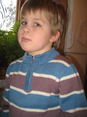Ekaluokkalainen oli kasvanut ulos villapaidoistaan. Halusin suunnitella kokonaan neulekoneella tehtävän peruspuseron, joka olisi helppo pukea päälle ja jonka valmiiksi lasketuista silmukka- ja kerrosmääristä olisi hyötyä myös tulevina vuosina.