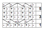 Luo 63 silmukkaa ja jaa ne kolmelle sukkapuikolle. Yhdistä suljetuksi neuleeksi. Neulo 2 krs nurin. Aloita kaavion 1 kerros 1. Kaavion mallikerta toistuu kerroksen aikana 7 kertaa. Neulo seuraavat 5 krs:ta kaavion 1 kerrosten 2-6 mukaan. Kun olet neulonut kaavion kokonaan, neulo 2 krs nurin, sitten 2 krs oikein ja vielä 3 s oikein. Uusi kerroksen alku on tässä. Silmukat kannattaa jakaa uudelleen siten, että jokaisella puikolla on 21 s.