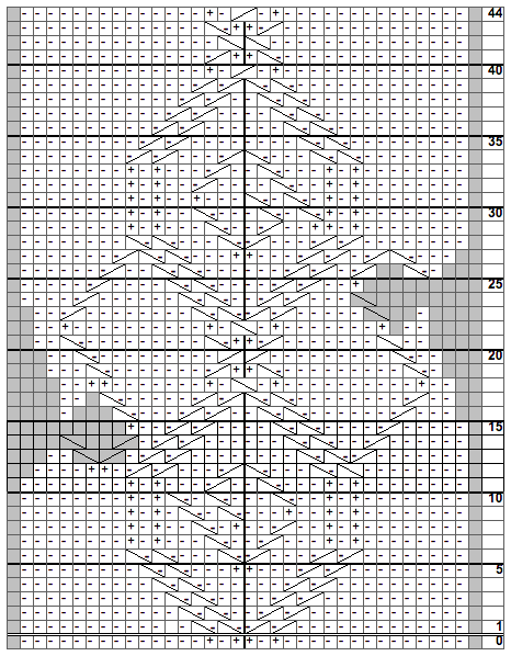 Seuraavalla kerroksella aloitetaan kaavio 2. Neulo 3 o, neulo kaavion kerros 0 (36 silmukkaa), neulo 24 o. Neulo tästä eteenpäin kaavion mukaan ja neulo kaavion ulkopuolisilla silmukoilla sileää oikeaa neuletta.