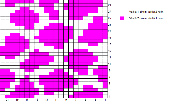Aloita neulominen kaavion mukaan. Huomioi, että kaavion jokainen ruutu merkitsee kahta silmukkaa, joista toinen neulotaan nurin ja toinen oikein. Oikein neulotut silmukat muodostavat etupuolen kuvion ja nurin neulotut takapuolen. Kuvio muodostuu siis molemmille puolille samanlaisena, vain värit ovat päinvastaiset.