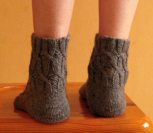 Luo 56 s ja jaa ne tasan neljälle sukkapuikolle. Neulo 2 o, 2 n -joustinneuletta 10 kerrosta. Seuraavalla kerroksella *siirrä 2 s apupuikolle työn eteen, neulo 2 s nurin, neulo apupuikon s:t o, neulo 2 o, neulo 2 n*, toista *-* kerroksen loppuun. Seuraavalla kerroksella välikerros ilman palmikonkiertoja, eli neulo 2 n, *4 o, 4 n*, toista *-* vielä 5 kertaa, neulo 4 o ja 2 n. Neulo sen jälkeen jälleen palmikonkiertokerros: *neulo 2 n, siirrä 2 s apupuikolle työn eteen, neulo 2 o, neulo apupuikon s:t oikein, neulo 2 n*, toista *-* kerroksen loppuun. Neulo 1 välikerros (oikeat s:t o, nurjat n). Seuraavalla kerroksella neulo *2 n, 2 o, siirrä 2 s apupuikolle työn eteen, neulo 2 n, neulo apupuikon s:t o*, toista *-* vielä 6 kertaa. Jatka sitten 2 n, 2 o -joustinneuletta 6 kerroksen ajan.