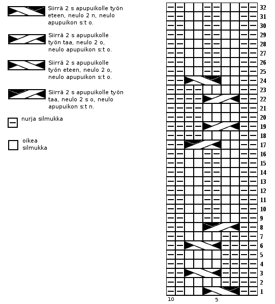 Neulo 1 välikerros. Neulo seuraavalla kerroksella 2 o, 4 n, *2 o, siirrä 2 s apupuikolle työn eteen, neulo 2 n, neulo apupuikon s:t o, neulo 2 n*, toista *-* kerroksen loppuun. Viimeinen palmikonkierto ulottuu nyt seuraavan kerroksen puolelle. Jatka sitten 2 n, 2 o -joustinta 8 krs.