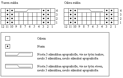 VarsiLuo 48 s. Jaa silmukat tasan neljälle puikolle ja aloita mallineule vasemman sukan kaavion mukaan pyöröneuleena. Kaavio toistuu kerroksella neljä kertaa. Neulo vartta 9 täyttä mallikertaa sekä 10. mallikerrasta kaavion kolme ensimmäistä kerrosta (= 39 kerrosta).