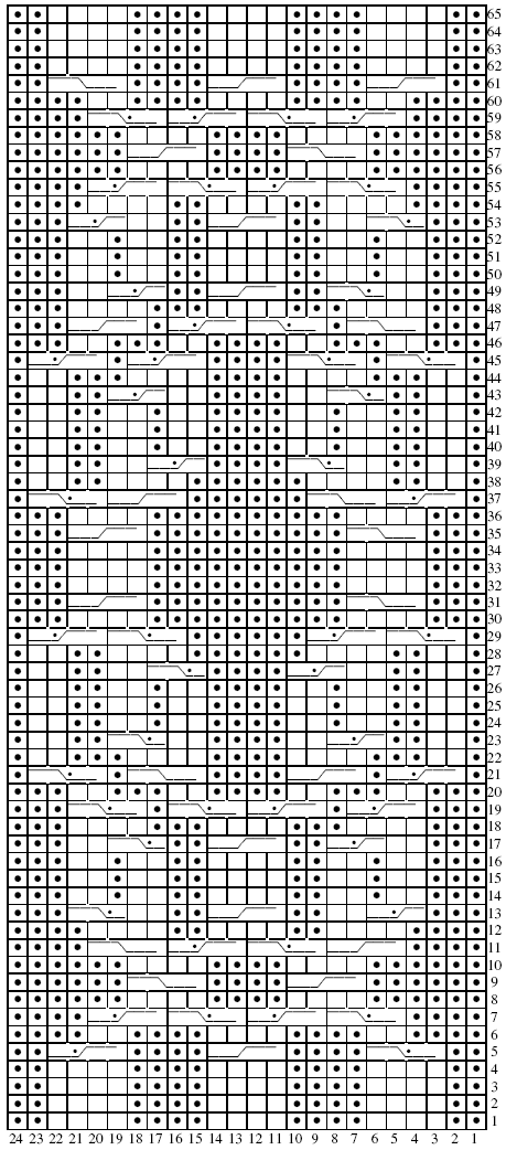 Jatkossa neulo jokainen kerros: 2 o, 2 n, 2 o, Kaavio, 2 o, 2 n, 2 o, 2 n, 2 o, Kaavio, 2 o, 2 n. Neulo näin, kunnes olet neulonut kaavion kerroksen 65. Päättele silmukat.