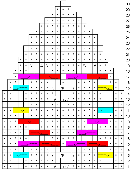 Neulo jatkossa kerroksen 14.-36. silmukoilla kaavion kerrokset 2-12 kerran ja sen jälkeen kerrokset 1-12 kahdesti. Neulo samalla muut silmukat oikein. Tämän jälkeen jatka palmikkokuviota kaavion kerrosten 13-30 mukaan. Kun aloitat kerrosta, joka vastaa kaavion kerrosta 15, aloita päälakikavennukset. Neulo 10 o, 2 o yht, ylivetokavennus, kaavion krs 15, * 2 o yht, ylivetokavennus, 20 o *, toista *-* kerran ja neulo 2 o yht, ylivetokavennus, 10 o. Neulo seuraava kerros ilman kavennuksia. Jatka kohdennettuja kavennuksia joka toinen kerros kaavion kerrokselle 25 saakka ja sen jälkeen joka kerros, kunnes silmukoita on jäljellä 9. Jokaisella kavennuskerroksella kavennusten väliset silmukat vähenevät siis kahdella. Katkaise lanka ja vedä silmukoiden läpi. Kiristä huolellisesti ja päättele.