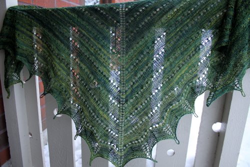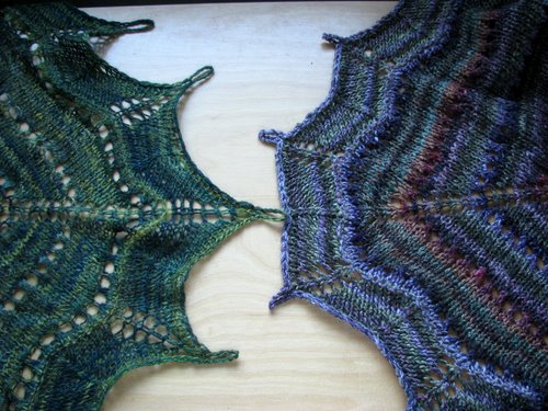 Huivin kolmion kärjen kuvio riippuu huivin koosta ja reunuksen toistojen määrästä. Rusehtavassa huivissa on 15 toistoa (pariton määrä) ja kolmion kärkeen osuu SSK. Vihreässä on 18 toistoa (parillinen määrä) ja kolmion kärkeen osuu lk.