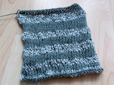 Testaamassani kerässä kaksi säiettä olivat selkeästi eripaksuiset, ja mallitilkkuun syntyikin epätasainen raidoitus. Monen mielestä tämä on varmasti hauska efekti, mutta itse en tästä ollut niin innoissani. Yksillä ja samoilla puikoilla lankaa neuloessani tummemmat kohdat ovat selkeästi väljempiä, jopa reikäisiä, ja toisaalta vaaleammat kohdat jopa turhan tiiviitä ja hyvin epätasaisen näköisiä. Kerässäni lisäksi vaaleammissa kohdissa langan paksuus hiukan vaihteli, mikä omalta osaltaan lisää näiden raitojen suttuista ulkonäköä. Neuloin tilkun 3,75 mm puikoilla, ja mielestäni syntyvä neulepinta ei näytä hyvältä ohuemmissa saati paksummissakaan kohdissa.
