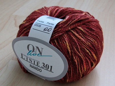 Online Nando on viskoosi-puuvillasekoite, jota myydään 50 gramman kerillä. Nando on rakenteeltaan 3 silmukan tuppilonauhaa, jossa ainakin testaamassani sävyssä 2 silmukkaa on neulottu yksivärisellä punaruskealla säikeellä ja kolmas silmukka vaihtuvavärisellä ja -paksuisella kelta-oranssilla säikeellä. Rakenteensa vuoksi langassa on hiukan joustoa. Langan neulominen kovin teräväkärkisillä puikoilla saattaa olla hankalaa, sillä puikon kärjet tuntuvat takertuvan lankaan sen erikoisen rakenteen vuoksi.