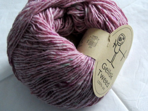 Geilskin Tweed on täysvillainen tweed-lanka. Langan tekee tweed-langaksi säikeeseen mukaan kehrätyt eriväriset nyppyset villaa. Testatussa vaaleanvioletissa kerässä nyppyjä on esimerkiksi kirkkaanvioletteja, vihreitä ja punaisia. Pohjavärinä villa on hieman meleerattua eli sekoitettu eri värisistä villoista, tässä tapauksessa valkoisesta ja vaaleanvioletista. Tweed-langat ovat makuasia, itsestäni tweed-pinta on kaunista ja eloisaa olematta kuitenkaan levotonta. Pienet väripilkahdukset eivät dominoi pinnan väriä, mutta tuovat siihen kuitenkin yhden ulottuvuuden lisää, jolloin pinnasta tulee pirteä. Lanka tavallaan on värikäs olematta värikäs.