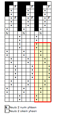 Luo 80 - 88 silmukkaa. Neulo 1 oikein kiertäen, 1 nurin -joustinneuletta 8 kerrosta. Vaihda mallineuleeseen aloittaen kaavion kerrokselta 1. Kun olet neulonut 2 mallikertaa, aloita kavennukset. Kavennukset on merkitty kaavioon mallikerran yläpuolelle.