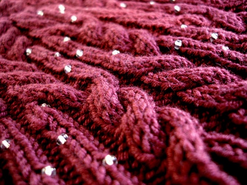 Laita halutessasi työhön silmukkamerkit 24 silmukan välein osoittamaan palmikkomallikerran toistoja. Vaihda työhön isommat puikot ja jatka neulomista ruutupiirroksen mukaan.