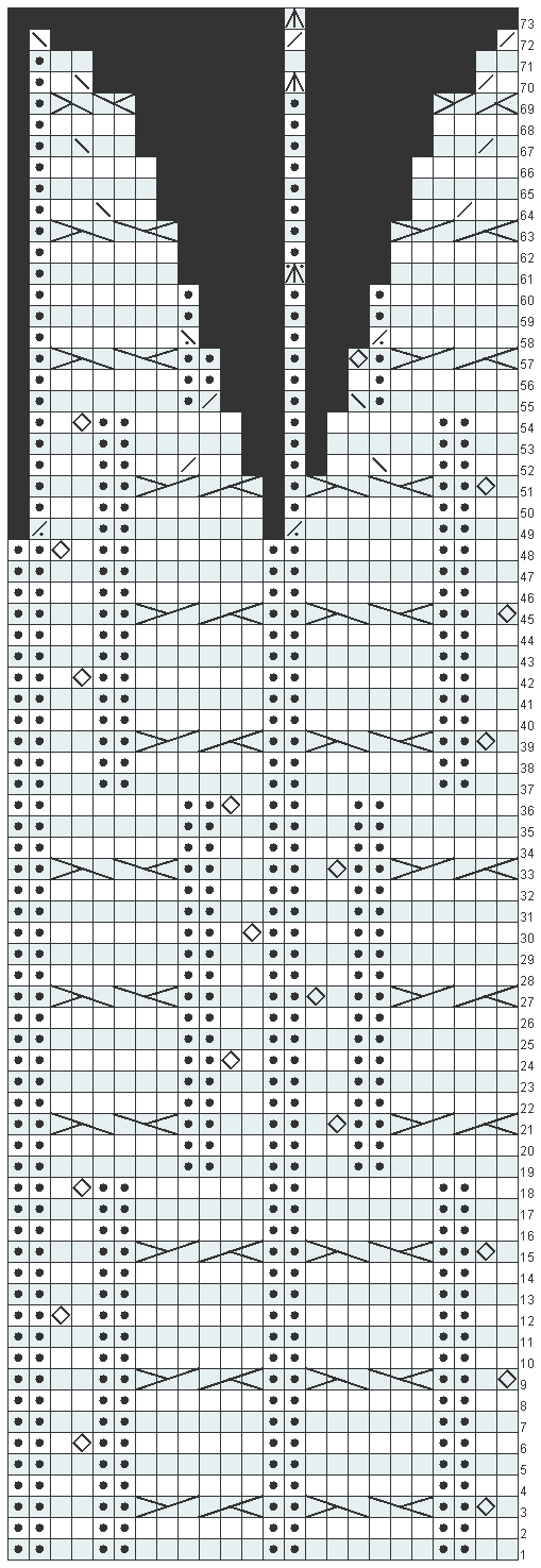 Ruutupiirroksen kerrokselta 49 alkavat päälaen kavennukset. Kerroksen 73 jälkeen työssä on jäljellä 5 silmukkaa.