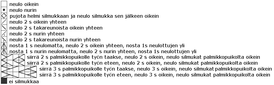 30 s ja 36 krs mallineuleen palmikkoneuletta pingoitettuna suuremmilla puikoilla = 10 cm