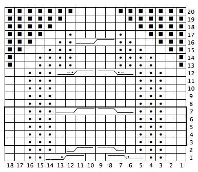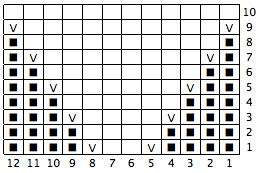 Toista kaaviosta 2 kerroksia 3-7 yhteensä 6 kertaa. Jatka sen jälkeen kohti kaavion yläreunaa. Aloita kärkikavennukset kaavion 2 kerroksella 13. Kavenna 1. ja 3. puikon lopussa kun on jäljellä kolme silmukkaa: neulo 2 o yhteen, 1 o. Kavenna vastaavasti 2. ja 4. puikon alussa: neulo 1 o, tee ylivetokavennus. Neulo ensimmäisen kavennuskerroksen jälkeen yksi kerros kaventamatta ja jatka sitten kavennuksia joka kerroksella.