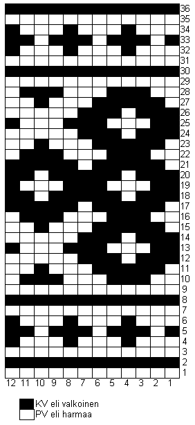 Neulo kaavion 1. krs lisäten kerroksen aikana tasaisesti 18 s. Työssä on nyt 168 silmukkaa. Neulo kaavion kerrokset 2-36.