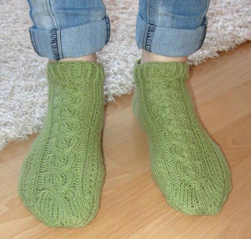 Olen herkkänahkainen enkä voi käyttää villavaatteita ihoani vasten. Kun näin kaupassa hyvännäköistä puuvillalankaa, tarttui se heti mukaani. Tuleva kevät inspiroi minua kokeilemaan, miten lanka toimisi sukissa. Koska puuvillasta ei saa yhtä joustavaa neuletta kuin villalangasta, jätin sukkien varret mataliksi ja suunnittelin koon niin, että se istuu melko tarkasti. Sukat onnistuivat hyvin ja ovat ihanat jaloissa sekä keväällä että kesällä! Nyt kevät on taas pian täällä ja päivät pitenevät vauhdilla. Tässä ohjeessa sukkien koristeena on keväisen vihreään lankaan sopiva palmikkokuvio.