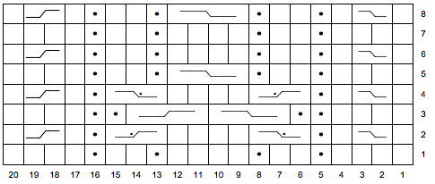 Aloita mallineule. Neulo 1. ja 4. puikoilla sileää sekä 2. ja 3. puikoilla kaavion mukaan. Jatka näin 10 krs.