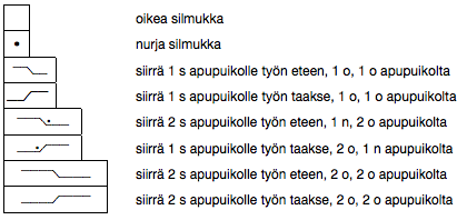 Neulo oikean puolen kerrosta (nosta 1, neulo 1), kunnes jäljellä on 7 s. Tee ylivetokavennus ja käännä työ. Neulo nurin, kunnes jäljellä on 7 s. Neulo 2 n yhteen ja käännä työ.