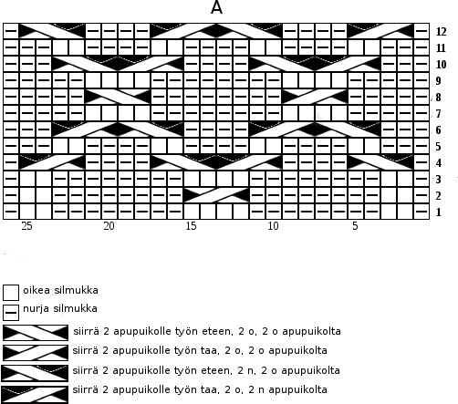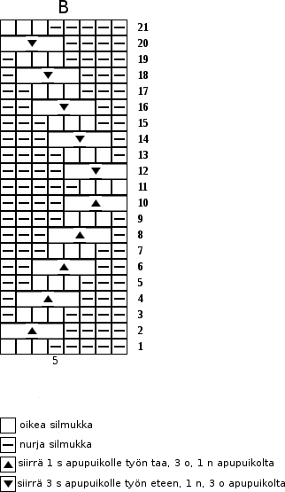 Toista kaaviossa A kerroksia 1-12 ja kaaviossa B kerroksia 2-21. Kun olet neulonut kaavion A 5 kertaa, neulo kaaviosta A vielä 9 krs. Seuraavalla kerroksella neulo 2 o, 2 n, *siirrä 1 s apupuikolle työn taa, neulo 2 o, neulo apupuikon silmukka nurin. Siirrä 2 s apupuikolle työn eteen, neulo 1 n, neulo apupuikon s:t oikein.* Neulo 2 n, 2 o, 2 n, toista *-*. Jatka 2 n, 2 o -joustinta kerroksen loppuun. Neulo joustinneuletta vielä 12 krs. Päätä silmukat riittävän löysästi.