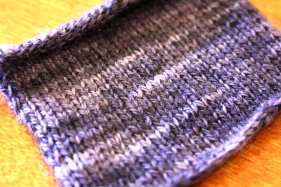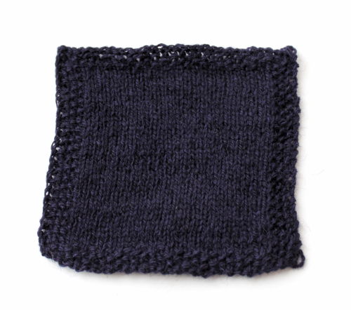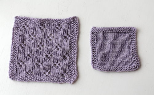 Vyötteen puikkosuositus 5 - 6 mm vaikuttaa turhan suurelta, minkä vuoksi valitsinkin mallitilkkuun 4,5 mm puikot. Mallitilkun tiheys ennen hellää käsinpesua oli 20 s ja 26 krs, mutta pesussa tiheys väheni 18 silmukkaan. Tämä muutos on sen verran merkittävä, että itse en tekisi istuviksi tarkoitettuja neuleita Usvasta.
