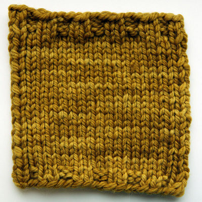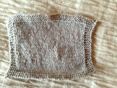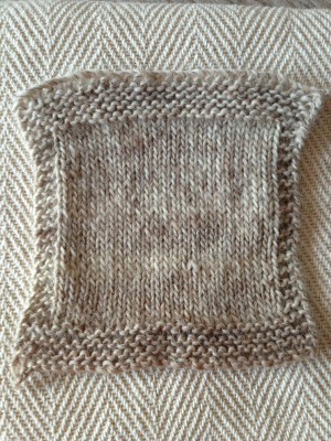 Neuloin lankaa kuutosen puikoilla, mikä tuntuu olevan langalle sopiva koko. Tiheydeksi sain 14 silmukkaa ja 22 kerrosta kymmenellä sentillä. Tiheys ei muuttunut pesussa. Mallitilkku tuntuu mukavan napakalta, mutta on vielä notkea eikä tönkkö.