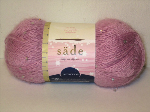 Novita Säde on taas uusi paljettilanka, joka korvaa vanhan Novita Crystalin. Langoissa on käytetty samoja kuituja, mutta erilaisissa määräsuhteissa. Lankakaupassa myyjä kehui, että Säde kelpaa täydellisesti korvaavaksi langaksi Crystalin ohjeisiin, kunhan sitä käyttää kaksinkertaisena. No, lankojen juoksevuus olisi samanlainen, jos Sädettä käyttäisi kahdeksankertaisena, mutta kolminkertaisella Säteellä pääsisi varmaankin jo aika lailla vastaavaan paksuuteen.