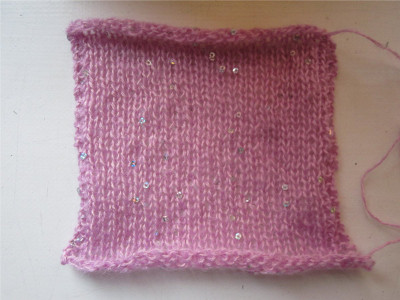 5 mm:n puikot tuottivat minun standardikäsialallani juuri ohjetiheyden mukaista jälkeä, joka ei muuttunut kasteltaessa. Sen sijaan jo pelkkä kuumalla vedellä kastelu sai langan mohairpinnan huopumaan tiiviimmin itseensä kiinni ja siten pörröisyys väheni. Positiivista kyllä, langan mohair ei ollut yhtään kutittavaa ennen eikä jälkeen kastelun. Tästä langasta siis kyllä uskaltaisi tehdä iholle tulevia asusteita, kuten pipoja ja kaulahuiveja. Toisaalta ainakin tämän langan roosa sävy sai minut kuvittelemaan tästä tehdyn pienelle tytölle esimerkiksi juhliin sopivan mekon.