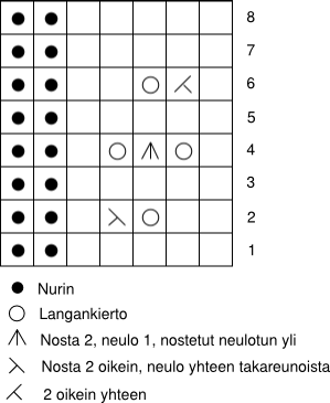 7. krs *kahden silmukan kavennus, 1 n*, toista *-*.
