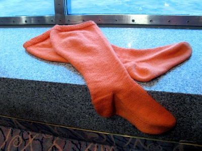 Jatka ilman kavennuksia, kunnes sukan varsi on sopivan mittainen. Kokeile pituutta siten, että taitat joustimen taitekerroksen kohdalta ja vedät taitteen yläreunan aivan polvitaipeeseen asti. Sukan varren tulee ylettyä mukavasti nilkkaan asti. Jos epäilet, neulo vielä muutama kerros: jos varsi jää liian lyhyeksi, joustin ei asetu polvitaipeen kapeaan kohtaan ja sukka valuu helpommin.