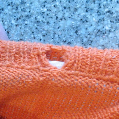 Käännä taite sukanvarren sisäpuolelle ja ompele paikoilleen. Pujota kuminauha taitteen sisään ja solmi tai ompele sopivan mittaiseksi. Paras kireys löytyy kokeilemalla. Päättele langanpäät.